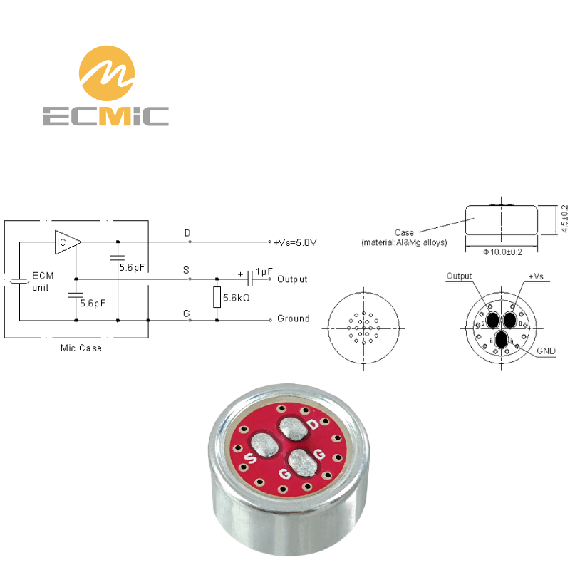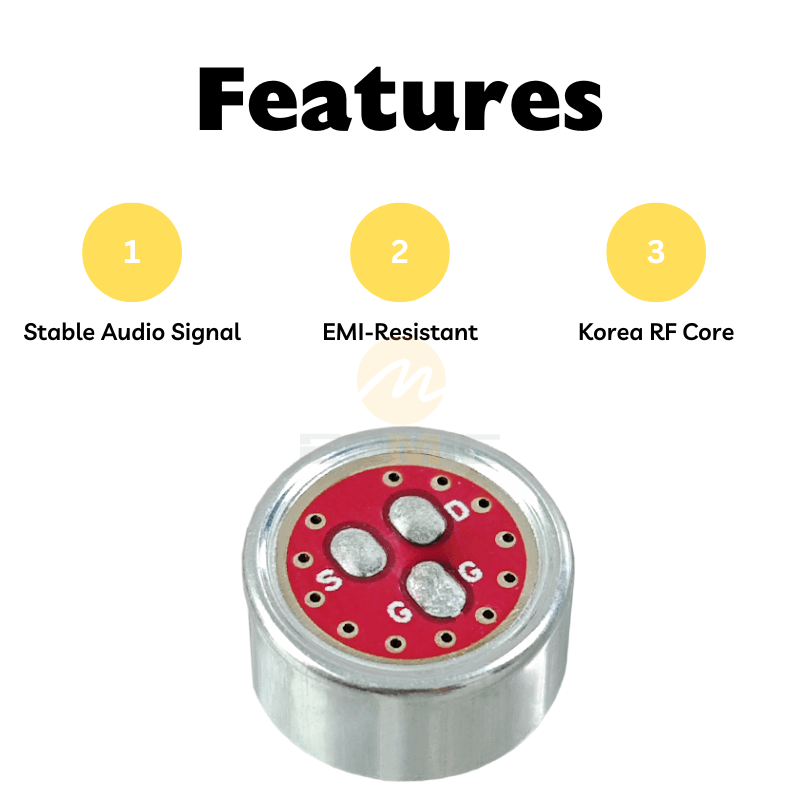 Der ECM-B1045UBT-Y390-967-2 ist eine 9,7-mm-Elektret-Kondensatormikrofonkapsel mit unidirektionaler Ausrichtung speziell entwickelt für zuverlässiger Betrieb in elektrisch verrauschten Umgebungen. Durch den Einsatz eines speziellen Korea RF-Mikrofonkerns bietet es verbesserte Immunität gegen elektromagnetische Störungen (EMI), und sorgt für eine stabile und klare Audioaufnahme.