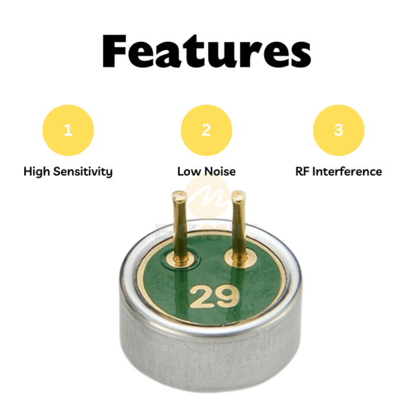 Φ6 × 2.7mm 크기의 컴팩트한 캡슐로, 전면 방진 메시와 개구부가 없는 밀폐형 뒷면이 있습니다. 1.9mm 간격의 2.8mm 핀이 장착되어 있습니다.